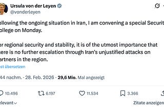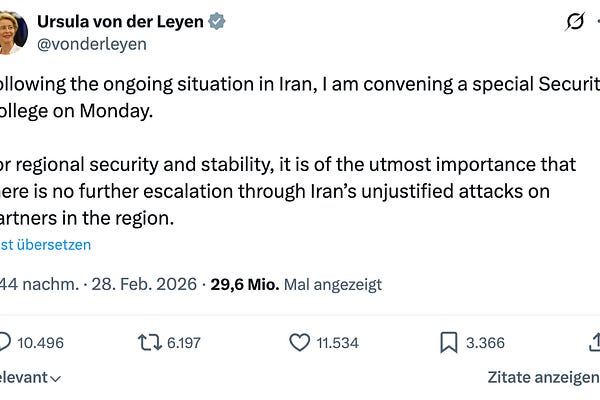 Noted geopolitical nonentity Ursula von der Leyen announces her determination to begin intensively monitoring the Iran situation as soon as…