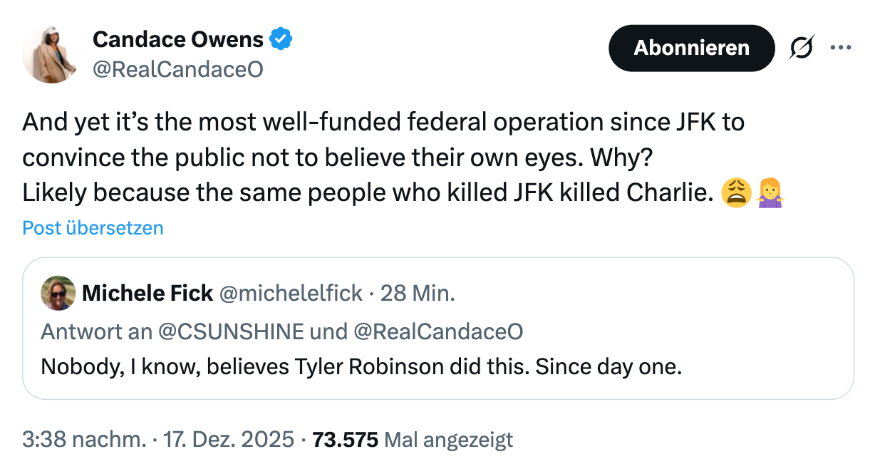 Candace Owens has dominated the Kirk conspiracy discourse. Her podcasts attract hundreds of thousands of live viewers and resonate across the entire internet. While she has yet to formulate a single, cohesive theory of Kirk’s death, Owens has disputed that Tyler Robinson acted alone, insisted that some foreign state actor (whether Israel, France or Egypt) may have been involved, and alternatively or simultaneously proposed that the assassination may have been coordinated within Kirk’s own organisation, Turning Point USA. Owens also alleged that the same network responsible for killing Kirk was also targeting her, that Kirk was likely killed “by the same people who killed JFK” and various other things that it is not worth my time to type or your time to read.