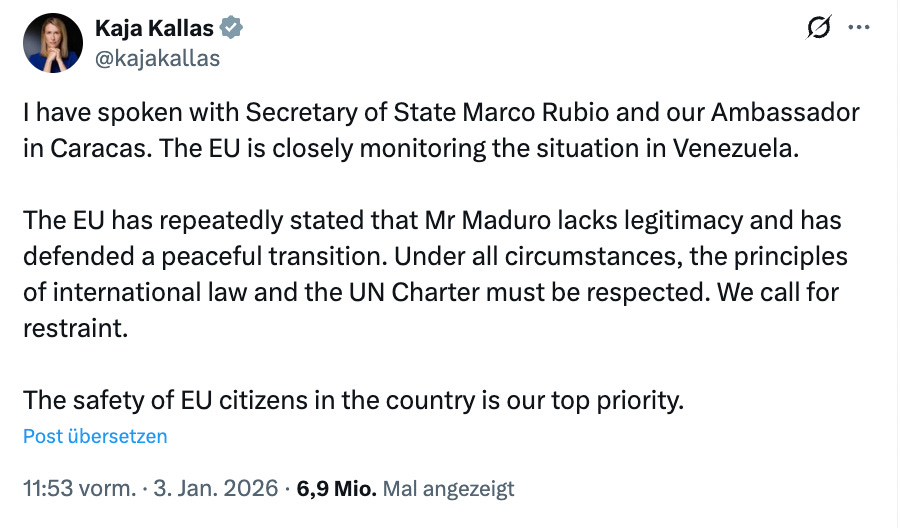 Very bizarrely, Kallas also announced that “the EU … has defended a peaceful transition” of power in Venezuela (I guess by tweeting), and she called for “the principles of international law and the UN Charter” to “be respected.” Finally, Kallas declared that “the safety of EU citizens in [Venezuela] is our top priority,” which in light of how much the rest of Kallas’s words are worth, probably means any EU citizens in the country should get the hell out of there.