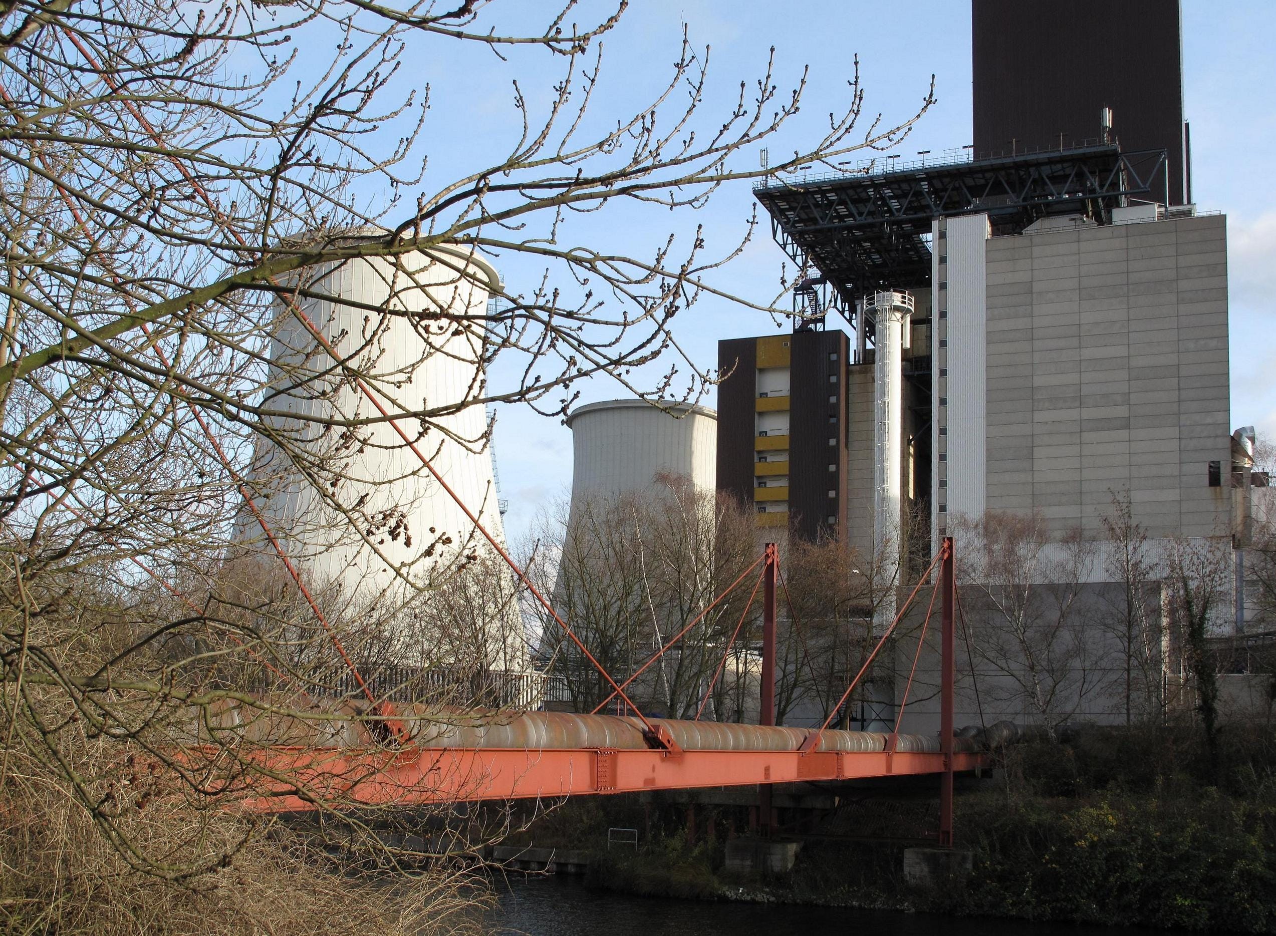 In the foreground, you’ll notice a suspension bridge carrying power cables across the waters of the Treptow canal. These cables bring power to hundreds of thousands of people in southwest Berlin.