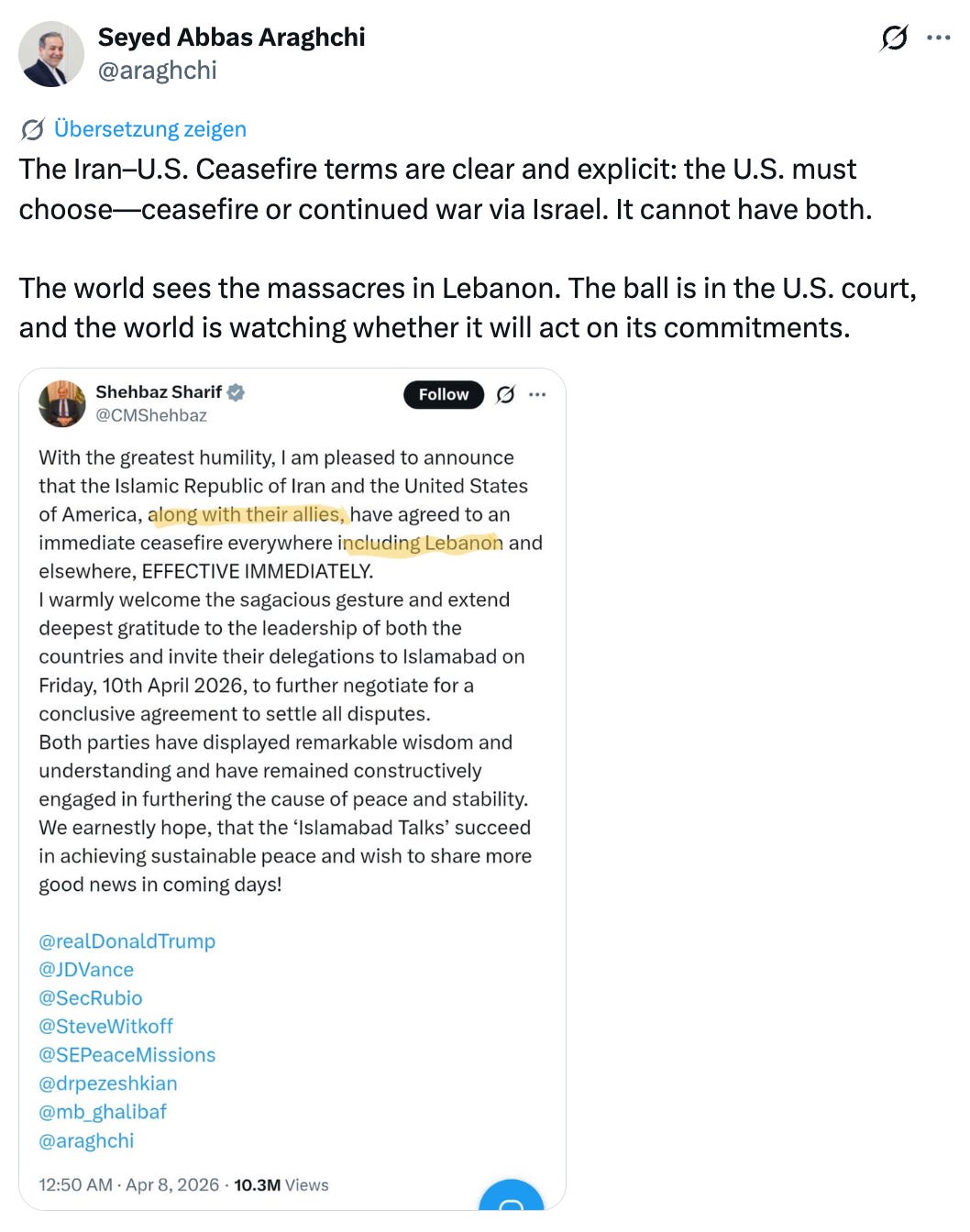 UPDATE: Iranian Foreign Minister Abbas Araghchi is threatening to scrap the ceasefire deal if Israel continues its attacks on Lebanon.