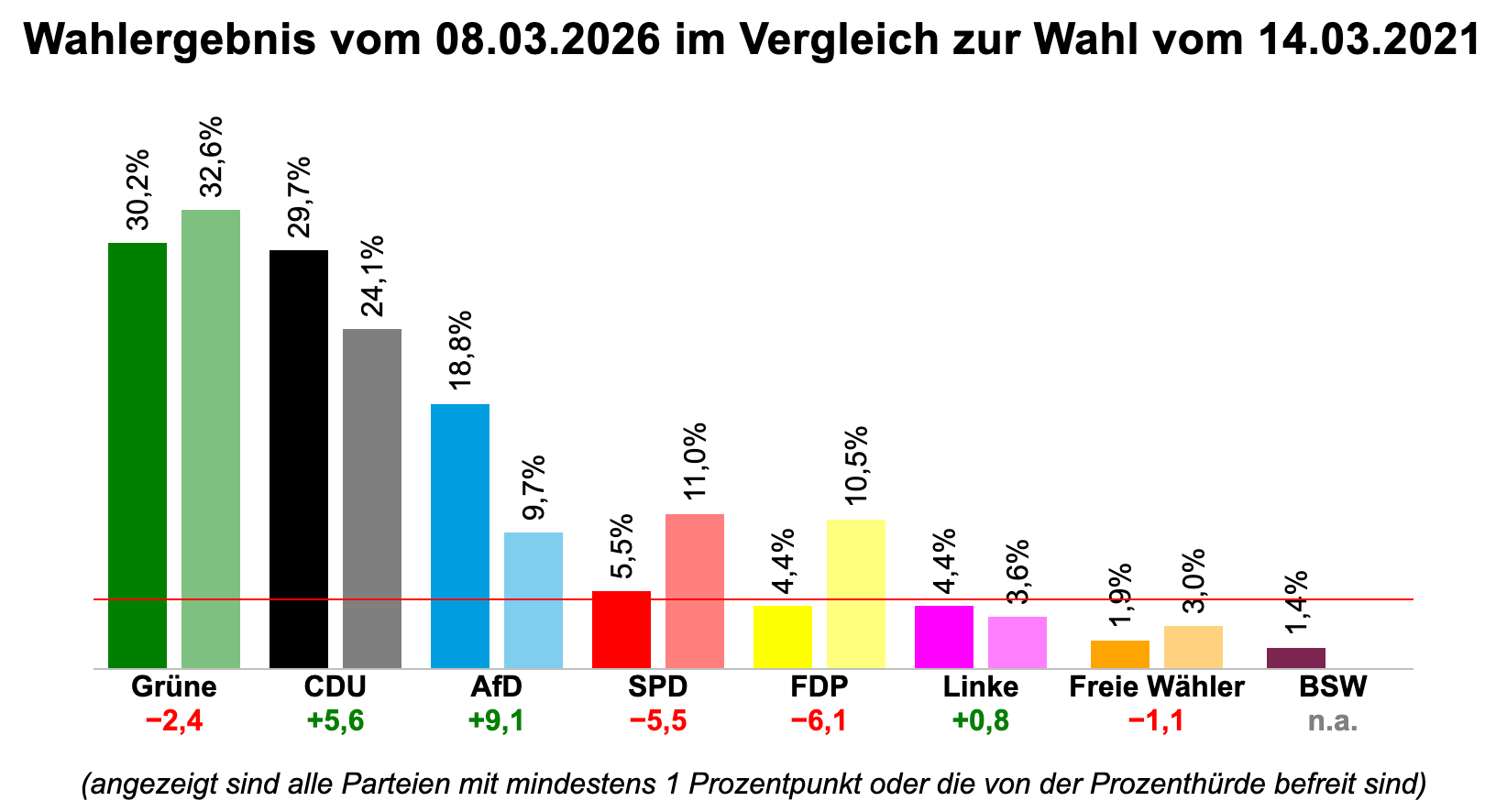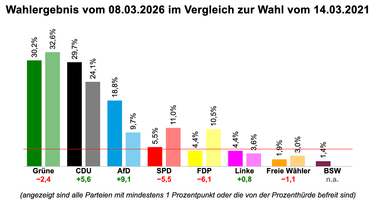 Yesterday evening, the bill for all of this humdrum imbecility came due. The Greens emerged as the winners, if barely, with 30.2% of the vote – just a few points down from their historic high of 32.6% in 2021. The CDU improved over their last showing but managed to underperform even the most pessimistic forecasts, with a mere 29.7%.