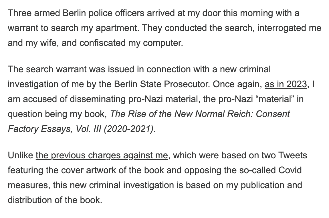 The thing that happened, is that an American living in Berlin had his house raided by the police and his computer confiscated, all because he published a book with a swastika on the cover: