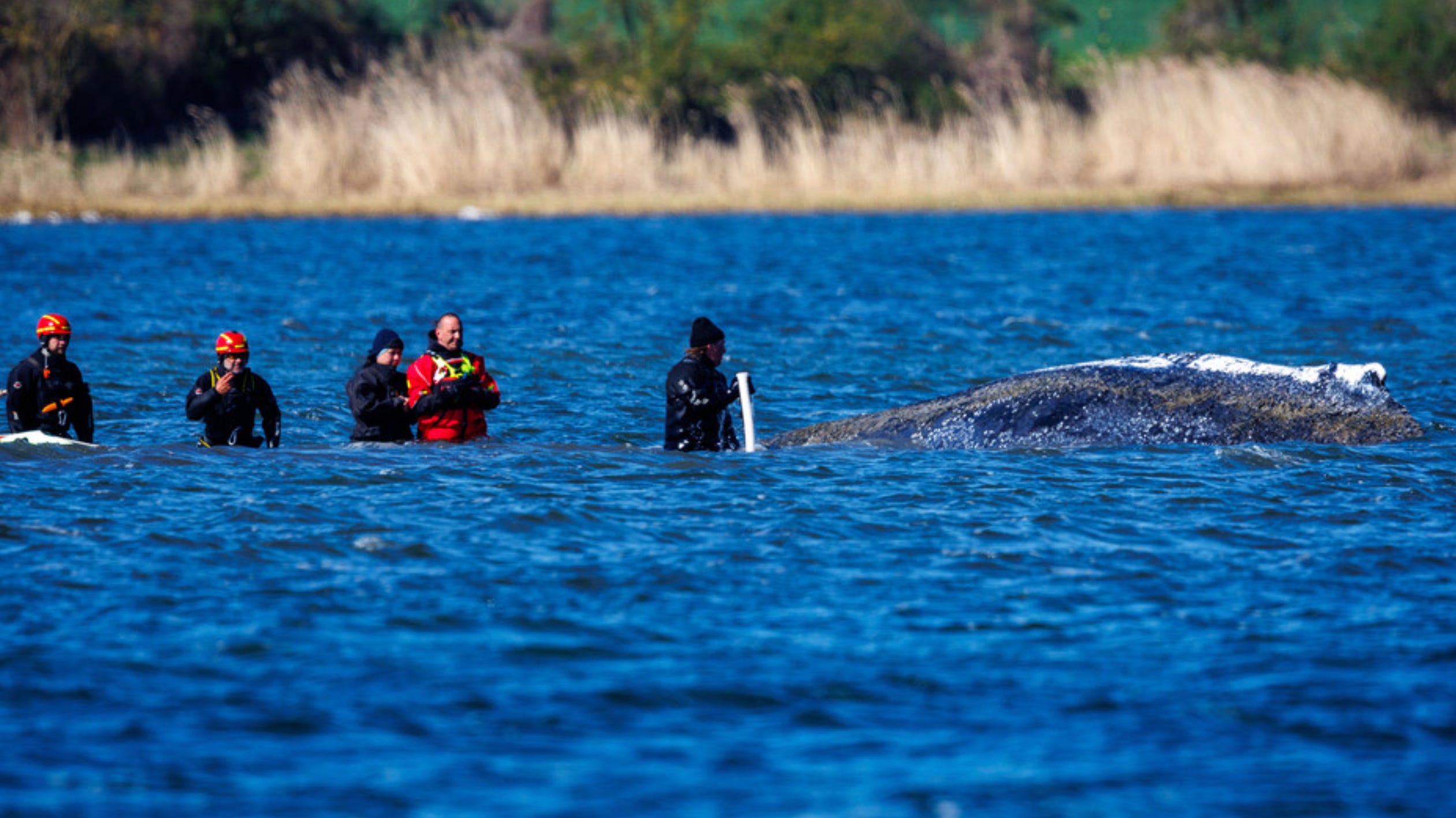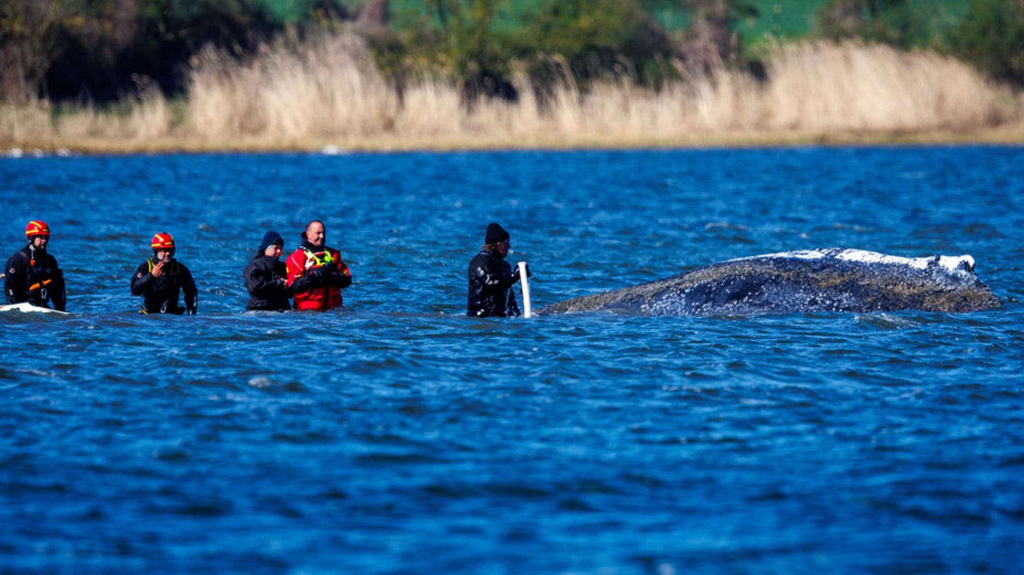 As I write this, rescuers have brought in an excavator to dig Timmy free of his sandbar in Wismar Bay. A few hours ago they tried to feed him a lunch of shrimp and herring. One of Timmy’s veterinarian attendants has abandoned the mission in outrage and is screeching on Facebook that a lot of the people involved in the rescue effort are mere poseurs, which is something nobody would’ve ever guessed. In an “IMPORTANT UPDATE”, ZDF reports on the opinion of a “whale researcher” who believes present efforts “are against the whale’s best interests.” You can watch the livestream here, along with millions of other Germans.
