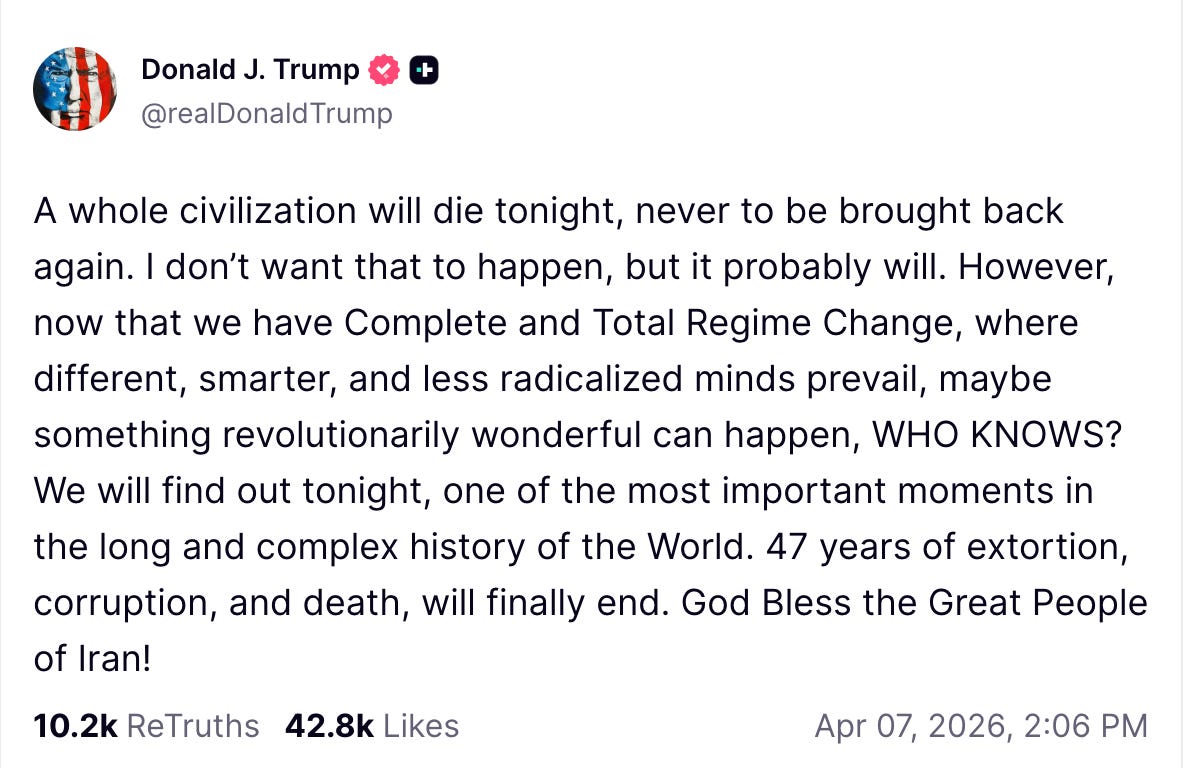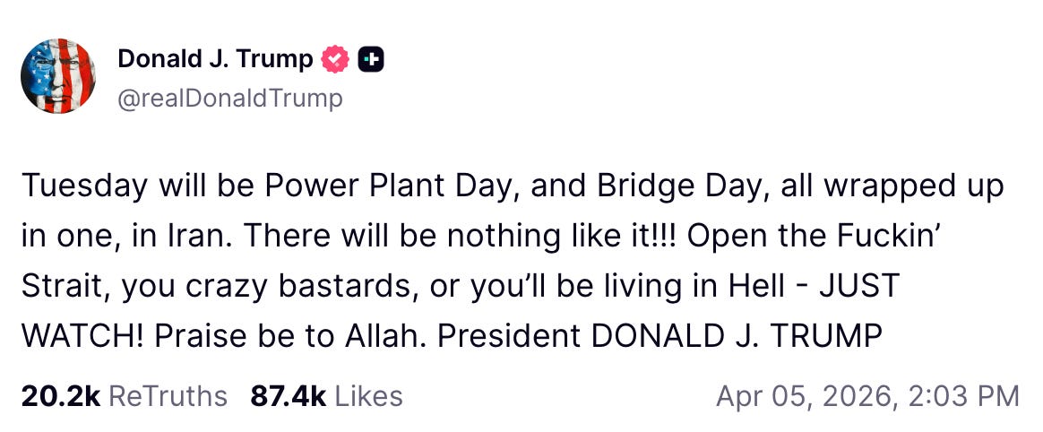 The second possibility is that Trump is totally serious, and that in a final effort to bring about a change in Iranian leadership he and the Israelis will go all out against energy targets in the Islamic Republic. I can also envision a third and middle path, in which the Americans and Israelis try a partial escalation by way of threatening more. Earlier I thought a bluff was most likely, as this kind of all-out escalation is something that was already trialled in the form of the South Pars gas field attack and swiftly walked back. Trump knows very well the potential consequences here. Now I’m not so sure, but as I said, I’m eager to hear your thoughts.